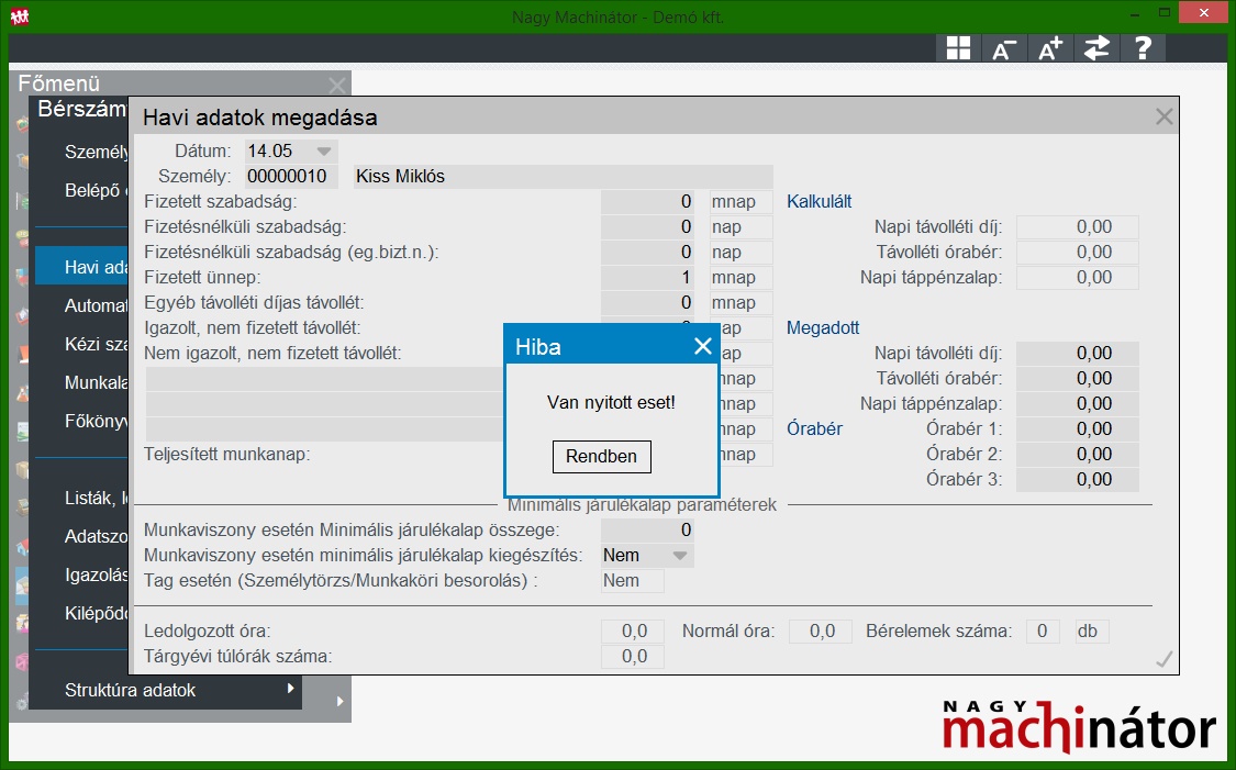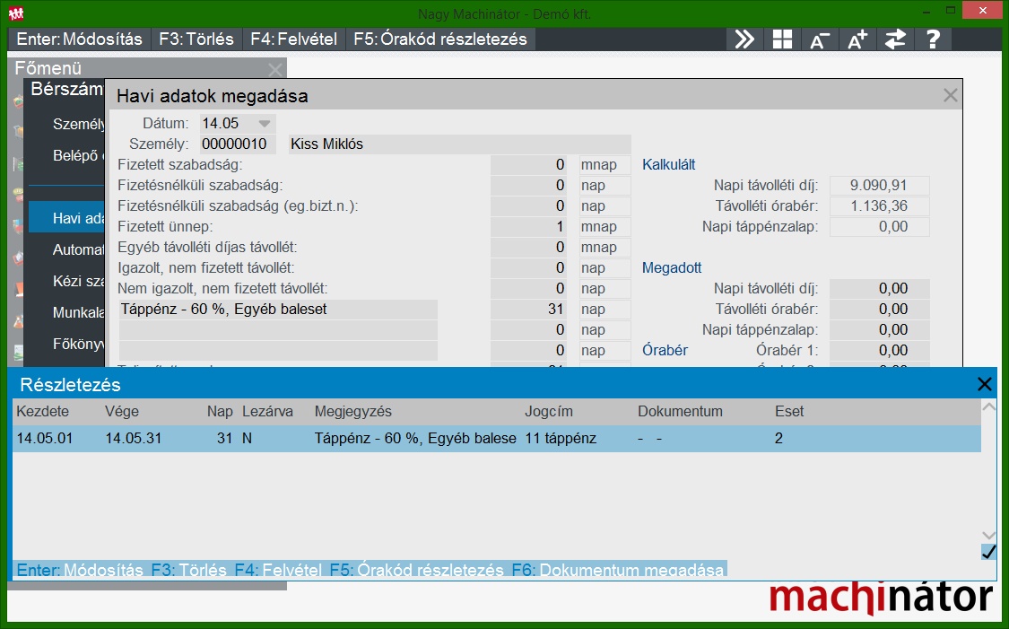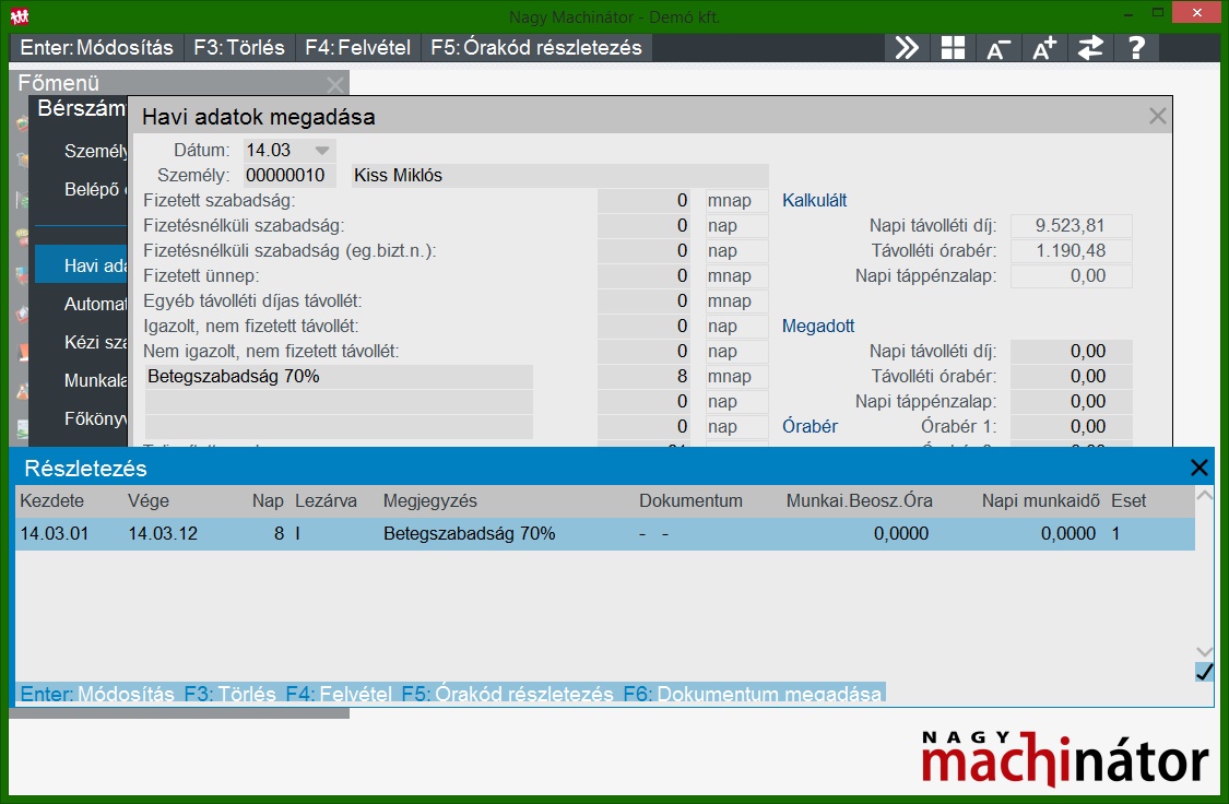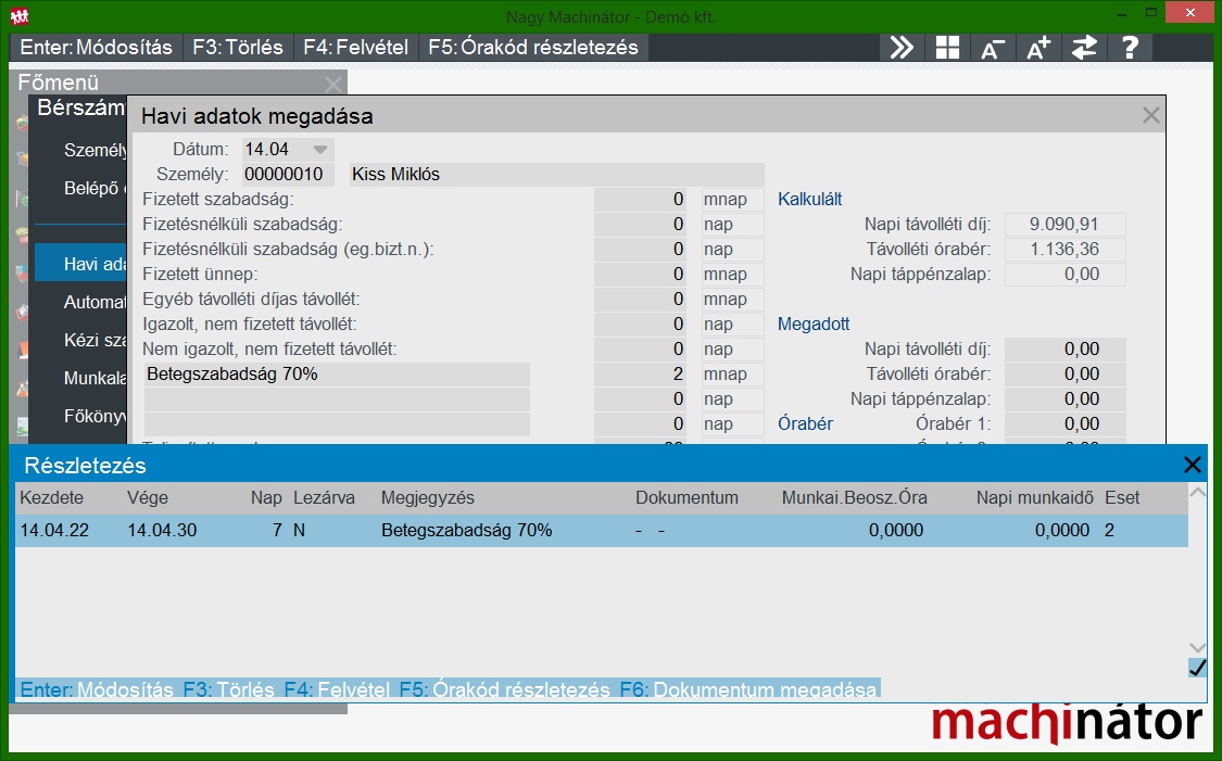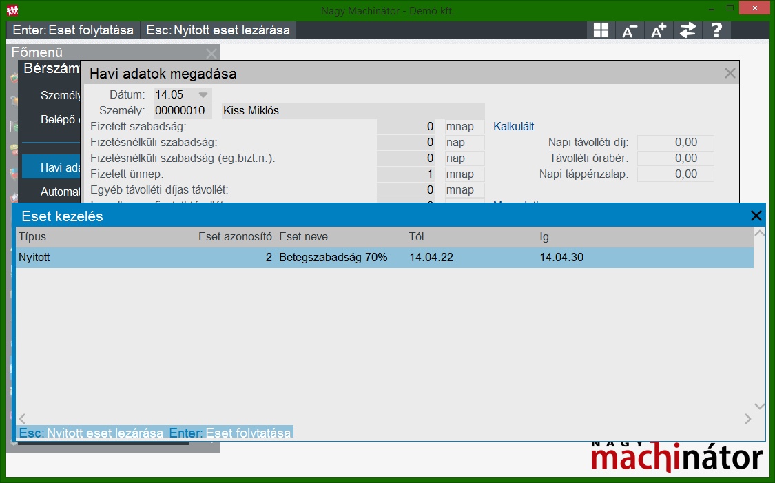 A következő hónapbana nyitott eset folytatásaként beajánlásra kerül a Táppénz. A dolgozó még 15 napot táppénzen volt, a hónap többi részében már dolgozott, így az esetet lezárhatjuk.