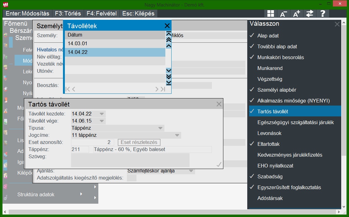 A Személy törzs / Tartós távollét alatt a dolgozónál az alábbiakat látjuk.