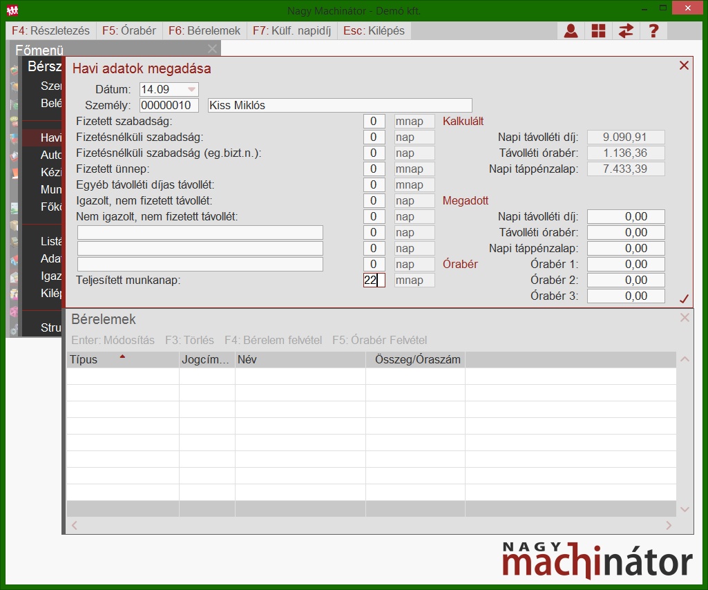 A havi adatok bevitele a havibéres vagy órabéres dolgozók időadatainak megadására, valamint a rendszeres vagy nem rendszeres bérelemek felvételére szolgál. A felvett bérelemek lehetnek járandóságok, levonások, adó(alap)növelő vagy csökkentő tételek. Az időadatok megajánlását (Teljesített munkanap stb.)a program egyrészről a Naptár [Alt - N], másrészről a személytörzs tartós távollétes adatai alapján végzi el. Amennyiben a naptár nincs feltöltve a program nem ajánl időadatokat.