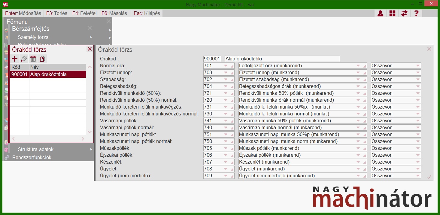 Az órakód táblában meghatározott órakódok szerint kerül számfejtésre a munkarend szerint ledolgozott óra, munkaszüneti nap, szabadság, betegszabadság és a pótlékos órák.