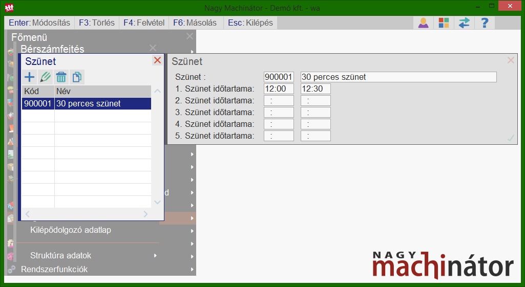 Egy szünet törzsön belül 5 időtartamot lehet megadni, ami a munkaközi szüneteknek felel meg. |