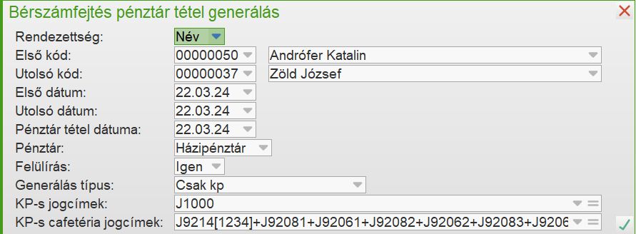 Az akcióval Nettó bér kifizetés típusú, kiadás irányú pénztártételek generálhatók megadott személyek megadott időszaki számfejtéseiről. Az akcióban meghatározható a cél pénztár, a pénztártételek dátuma, valamint a normál, ill. a cafeteria jogcímek. Utóbbiaknál (a konkrét jogcím képlet megadása mellett) alkalmazható az F6: Alaphelyzet gomb, mellyel a normál jogcímeb a J1000 kerül, míg a cafeteria jogcímekhez a Számfejtés paraméterekben megadott képlet.
