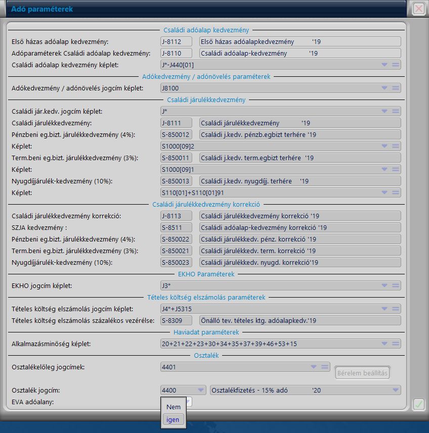 Itt adhatjuk meg a családi adóalapkedvezmény és a családi járulékkedvezmény számfejtését vezérlő jogcímeket, százalékos vezérléseket és képleteket.