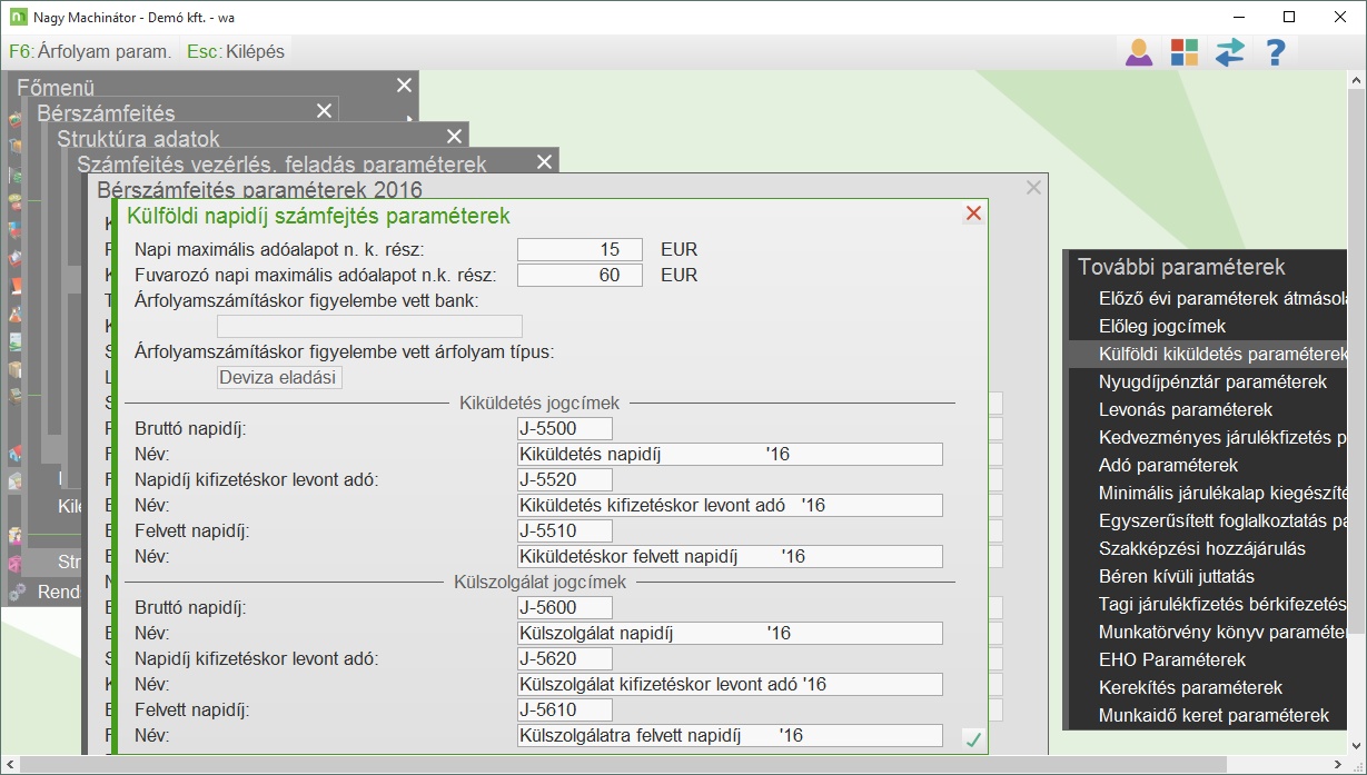 A Külföldi napidíj, Külszolgálati díj számfejtéséhez az alábbi paramétereket kell beállítani.