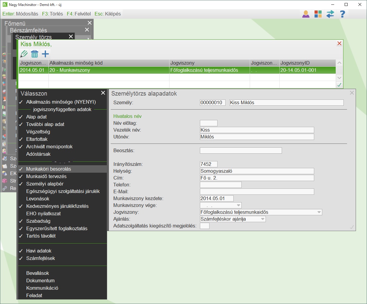 Amikor belépünk a személytörzsbe, választanunk kell a személy jogviszonyai közül, vagyis hogy éppen melyik jogviszonyával kapcsolatos adatokat szeretnénk felvenni, módosítani.