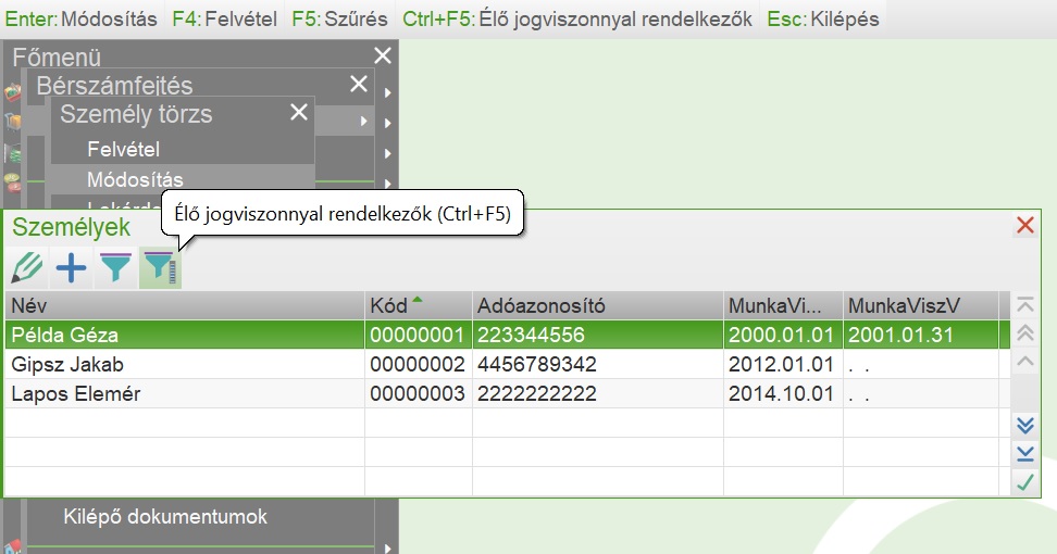 A választóablakban Ctrl+F5-tel szűkíthetünk a rendszerdátumon élő jogviszonnyal rendelkező személyekre.