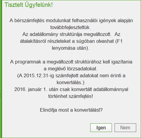 A konvertálás a 90-es verzió egy adott alverziójával való frissítés után az első Személy törzsbe, Havi adatokba, vagy Számfejtés menüpontba való belépéskor történik meg. A konvertálás szükségességére egy üzenet figyelmeztet. Igen-t választva lefut a konvertálás. Nem-et választva a konvertálás nem fut le, hanem egy általunk választott későbbi időpontban fog konvertálni.