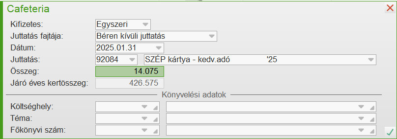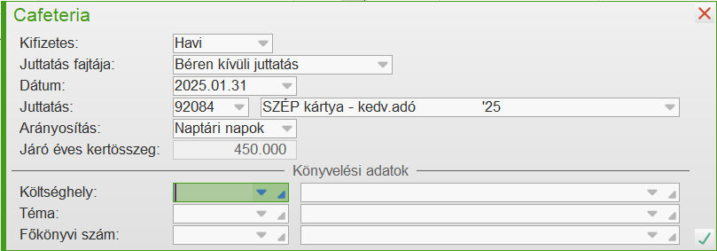 Példa: 2025.07.01-én lép be a dolgozó, számára SZÉP kártya juttatást szeretnénk adni, belépéskor 226.849 Ft lesz a Járó éves keretösszeg, mivel 450.000 / 365 * 184 = 226.849
