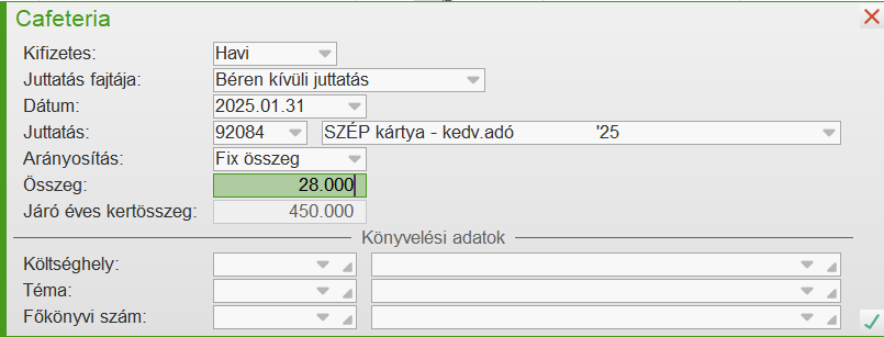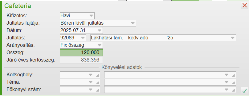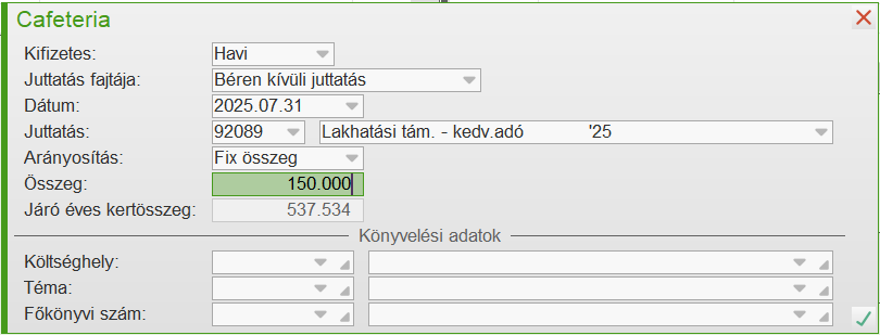 Ekkor minden hónapra generálódik 25.000 Ft béren kívüli juttatás.