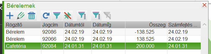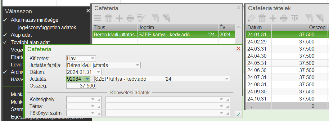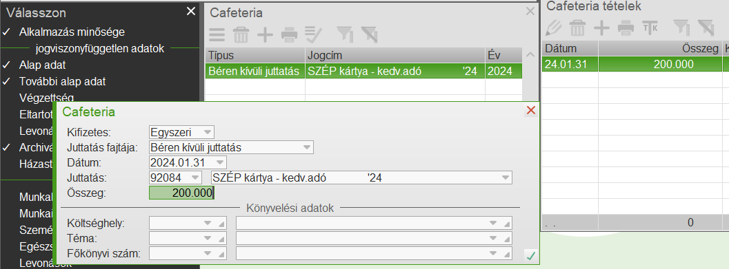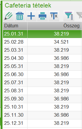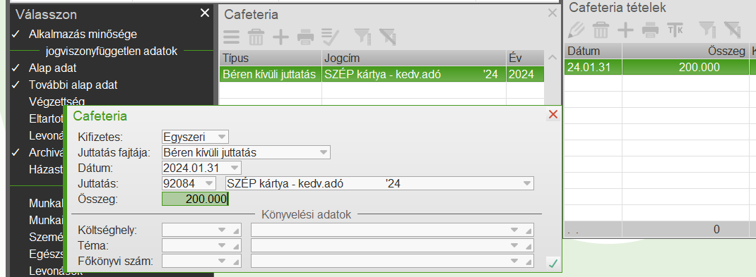 2017-től lehetőség van rá, hogy egy külön menüpontban tartsuk nyilván a cafetéria elemek számfejtését. Ha valaki ezen felületen szeretné vezetni a cafetériát, akkor a már meglévő bérelemeket le kell zárni a Bérelemek menüpontban.