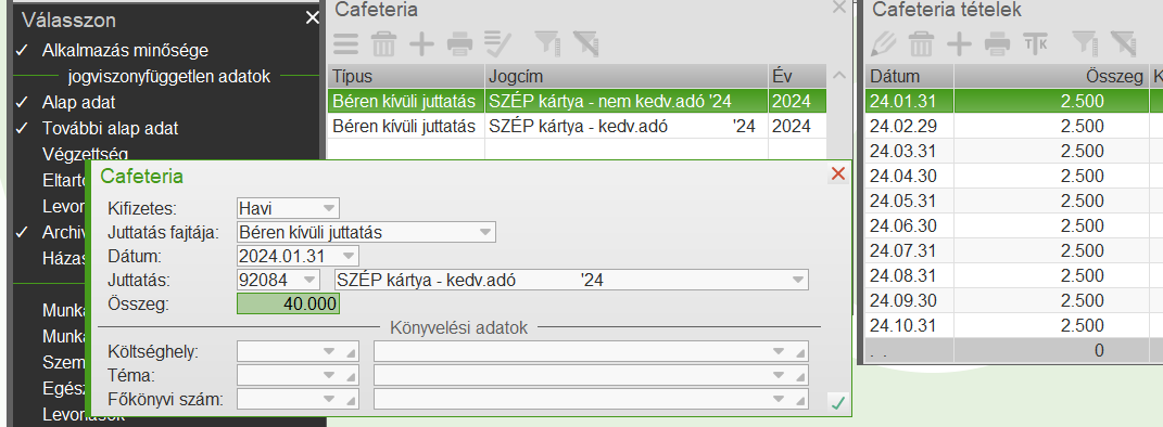 A dolgozónak egész évben fennáll a jogviszonya, havi juttatás kap, minden hónapban a maximum összeget. Rögzítjük év elején: