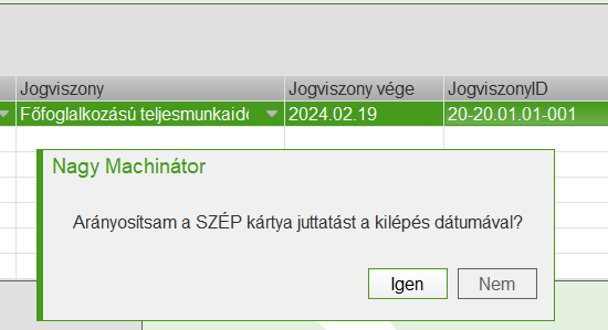 Kiléptetjük a dolgozót, ekkor a program megkérdezi, hogy arányosítsa-e a SZÉP kártya összegét. Amennyiben Igennel válaszolunk, két bérelem kerül generálásra, amelyek elvégzik a korrekciót: