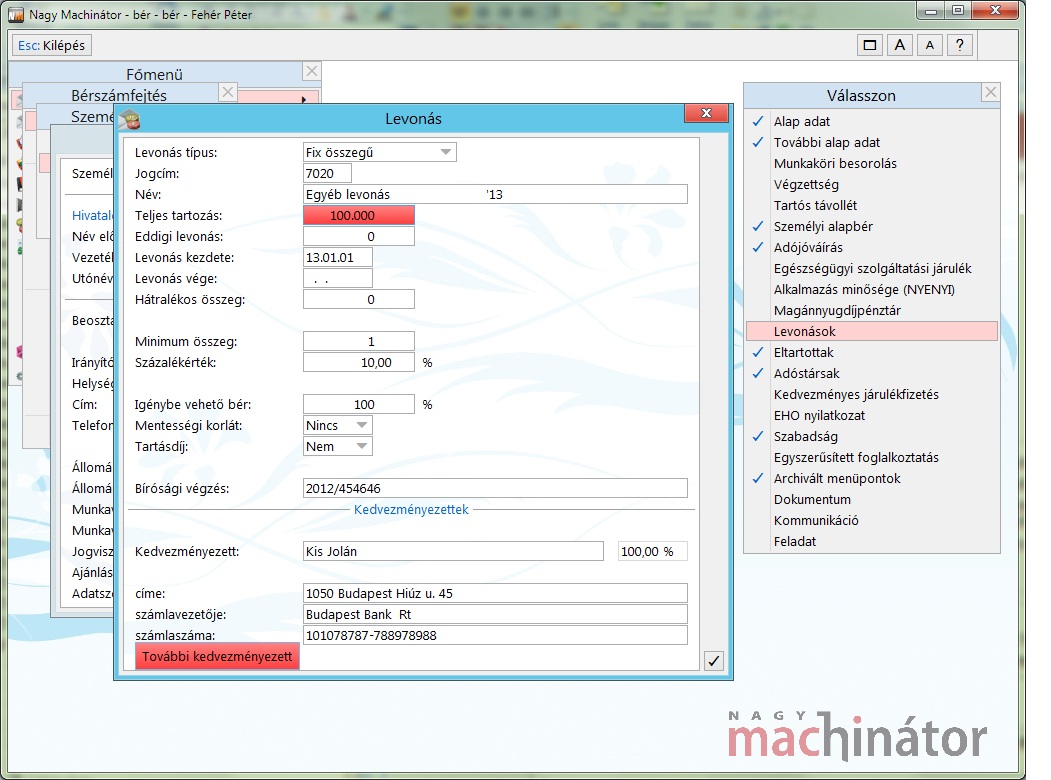 A levonás kezelésben nyilvántartott levonásokat fogja a program a meghatározott prioritás sorrendjében a nettó bérből levonni.