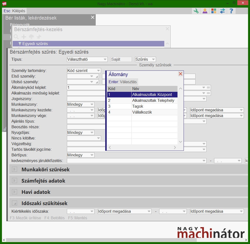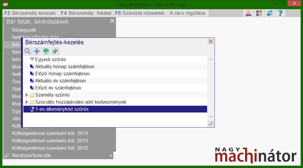 Mentsünk el egy olyan szűrést, amelyben csak az 1-es állománykódban szereplő dolgozók szerepelnek.