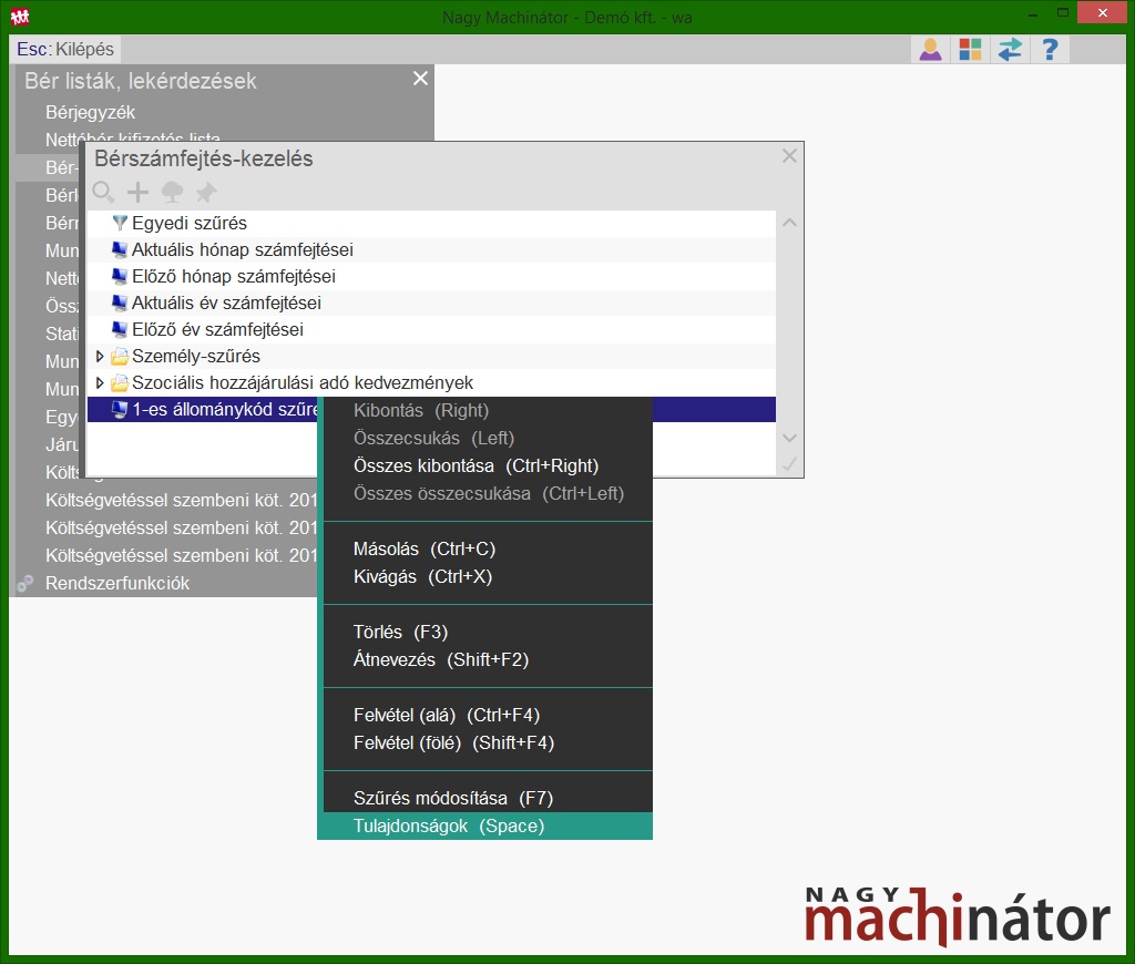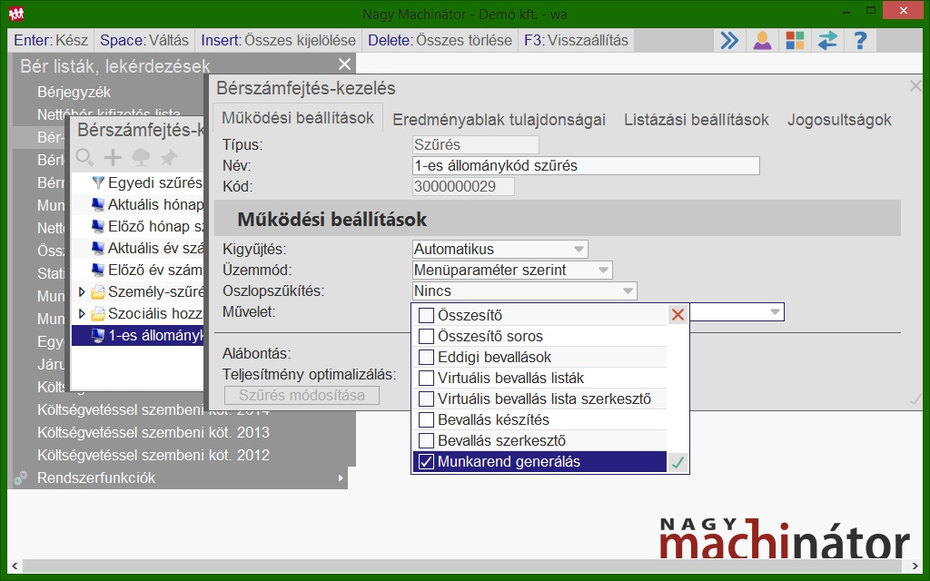 A mentett szűrésen jobb egérgombbal a Tulajdonságok(Space) menüpontot választva állítsuk be a Munkarend generálás műveletet.
