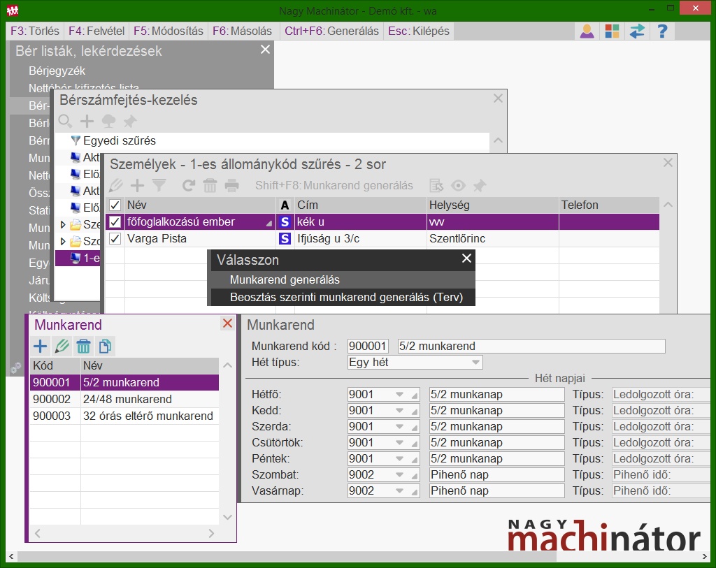 A Munkarend törzsben rögzített munkarendek közül rendelhetünk a szűrésnek megfelelő személy(ek)hez munkarendet.