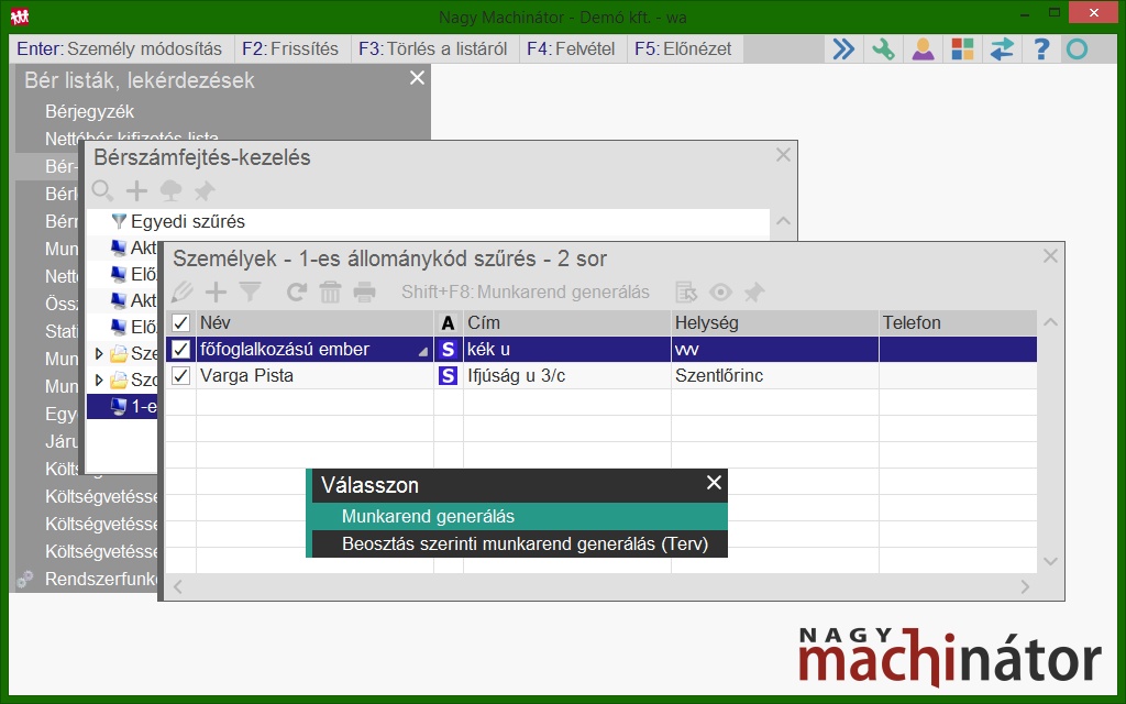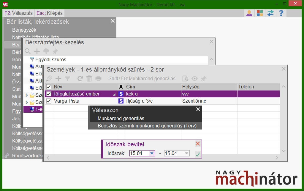 Elmentve, majd a szűrést elindítva a Shift+F8:Munkarend generálás gombot megnyomva kezdhetjük meg a kijelölt személyeknek a munkarend generálást.