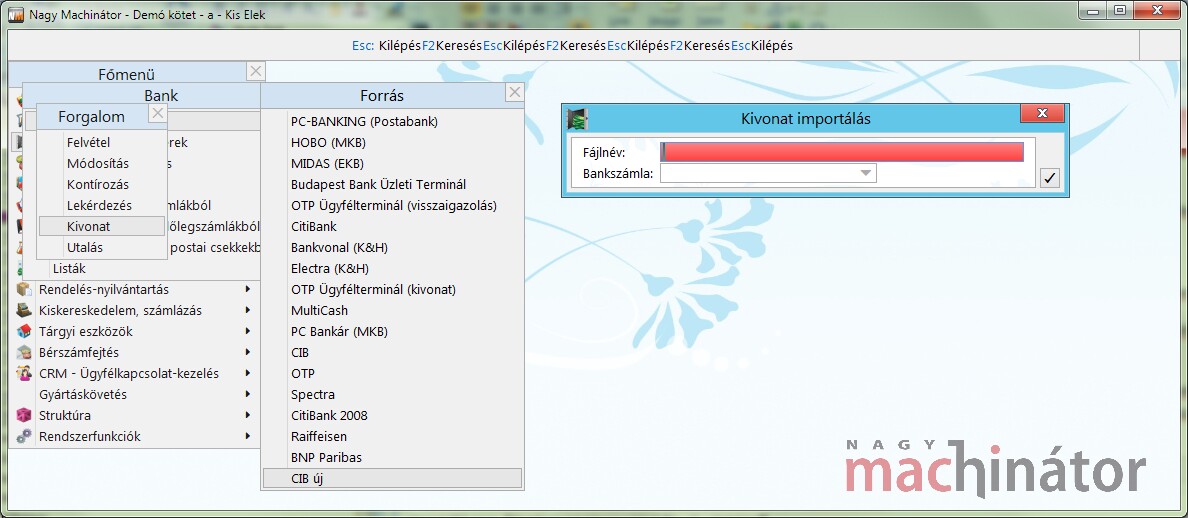 A funkció Home-Banking rendszerekkel történő kapcsolattartásra alkalmas. Az egyes banki rendszerekből kapott kivonat fájlokat dolgozza fel a program és készít bankbizonylatokat.