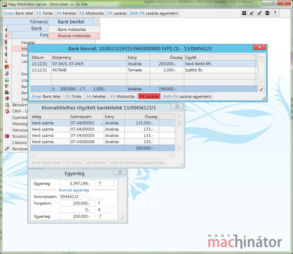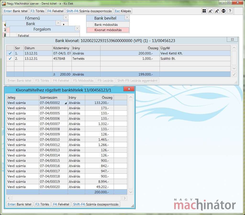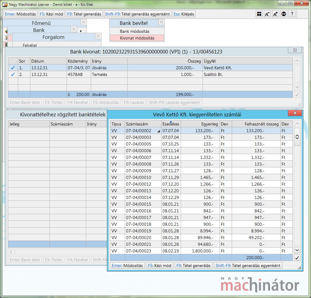F9: Tétel generálás után a program kivonattétel ablak alá "ragasztott" banktételek ablaka generálja felhasználói beavatkozás lehetősége nélkül a banktételeket.