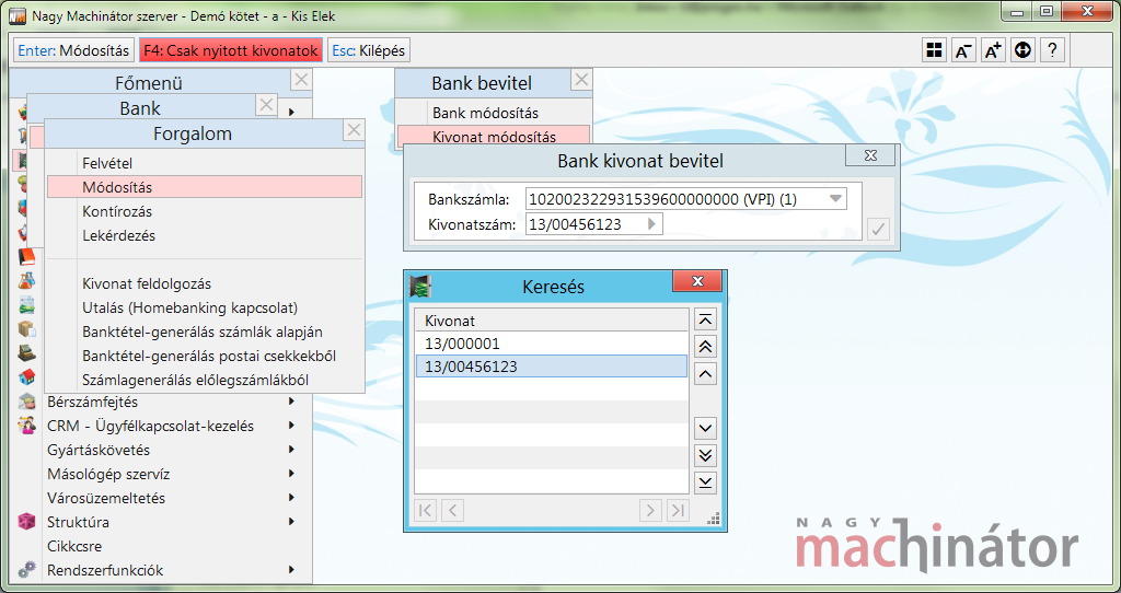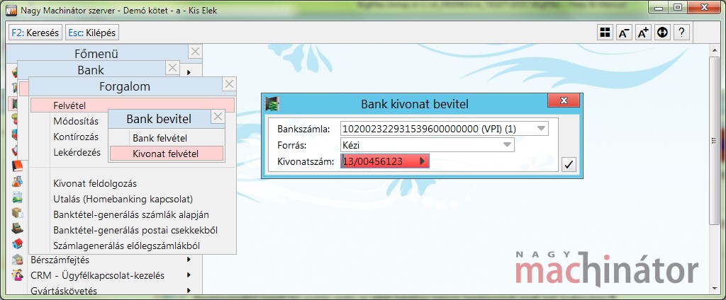 A bankforgalom rögzítésének félautomatizált módja, ha a bankforgalom funkció elindítása után a Kivonat felvétel menüpontot választják.