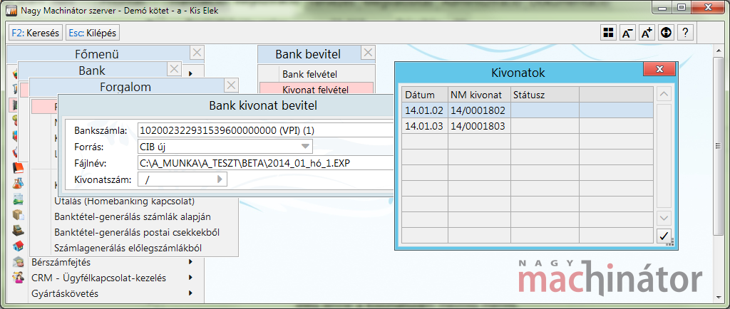 A menüpontot akkor kell elindítani, ha vagy megkaptuk postán a feldolgozandó kivonatot, vagy letöltöttük a bankterminálról a kivonat fájlt.