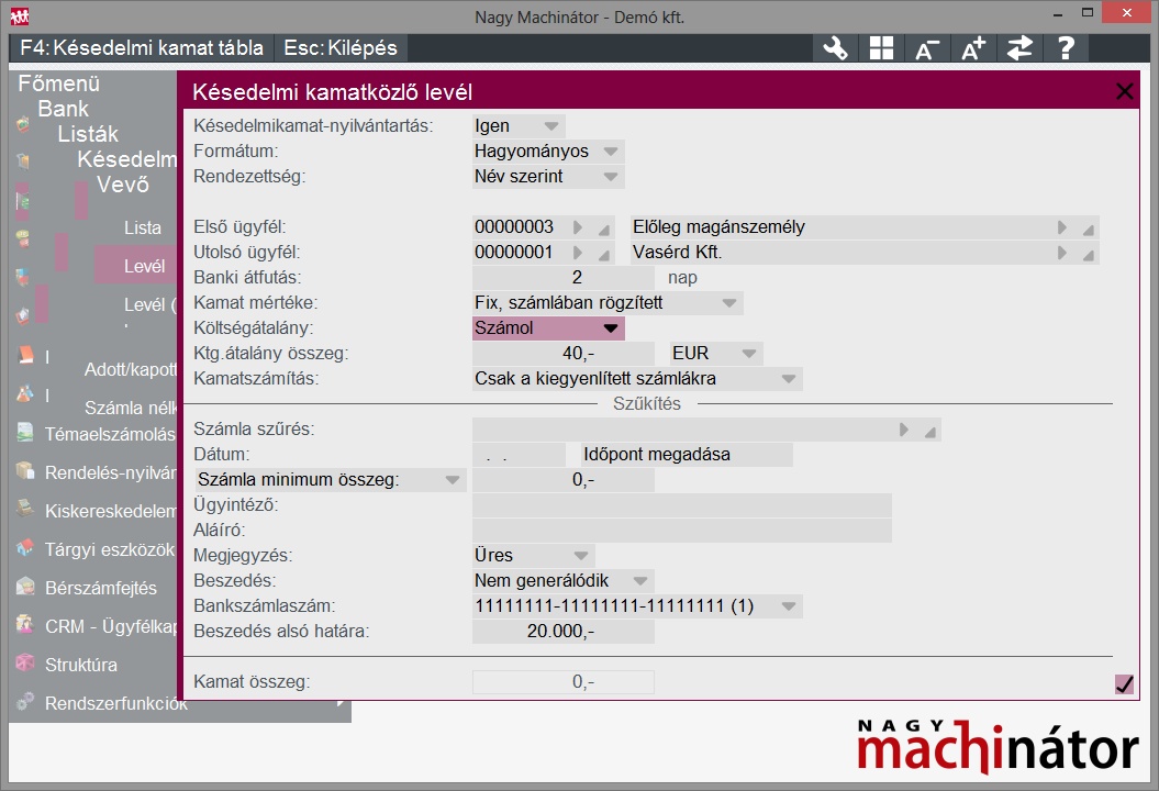 Ahhoz, hogy a program felszámítsa a késedelembe eső ügyfélnek a Költségátalányt, a Késedelmi kamatközlő levél lekérésekor kell beállítani. Ajánljuk, hogy a levél lekérésekor állítsák Igenre a "Késedelmi kamat nyilvántartást", így kerül be a nyilvántartásba a felszámított késedelmi kamat és költségátalány.