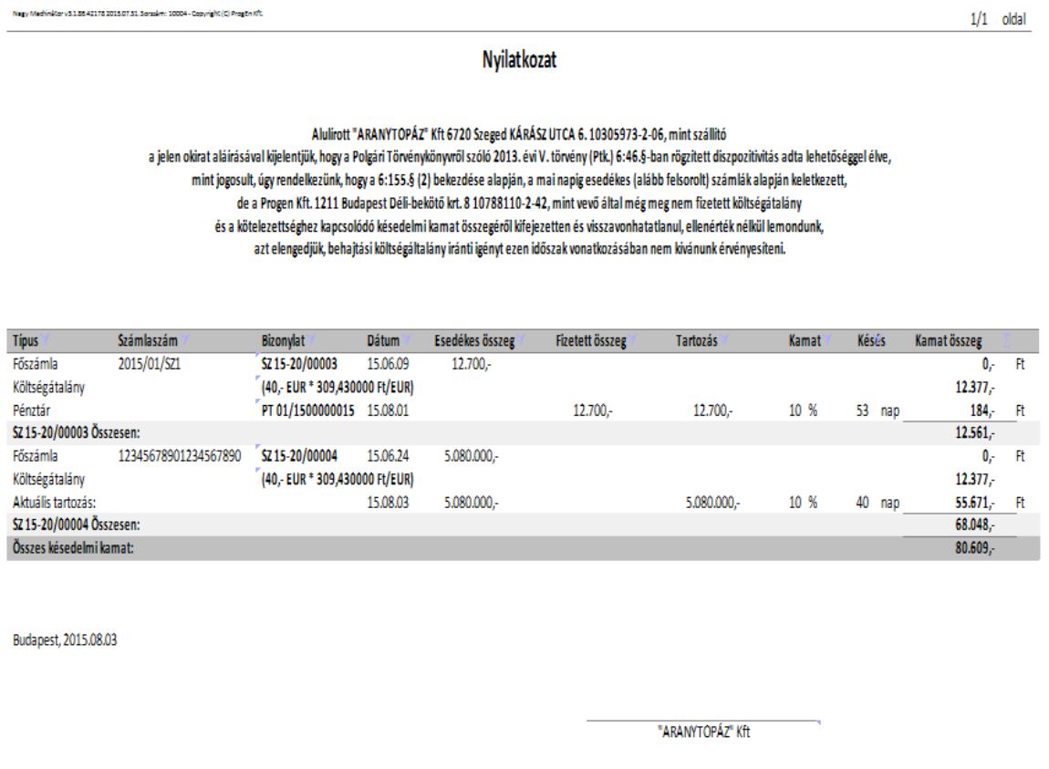 A nyilatkozat azt tartalmazza, hogy a szállítónk lemond a kamat és a költségátalány behajtásáról.