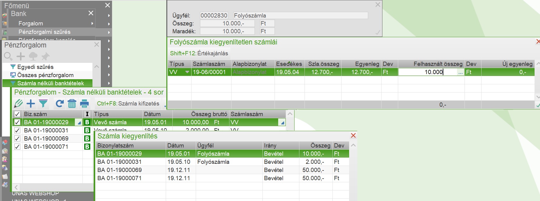 A funkcióval egy vagy több bank, ill. pénztártételt lehet bejövő vagy kimenő számlához kapcsolni, így azokat kiegyenlíteni.