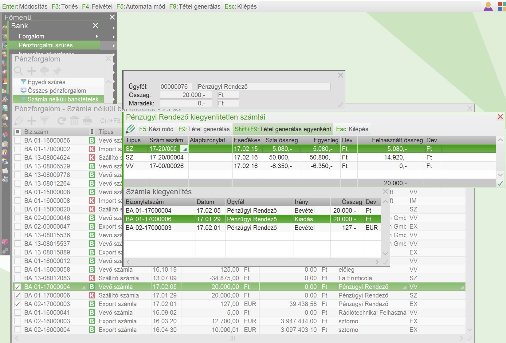 Szűréshez kapcsolt művelettel lehetőség nyílik a számla nélküli kiegyenlítések számlákhoz kapcsolására (pl. előre fizetés vagy olyan bevétel, melynél a tétel rögzítésekor még nem tudtuk, mire utalt a vevő, ill. egyösszegű utalás, melyet több szállítószámlához kívánunk kapcsolni).