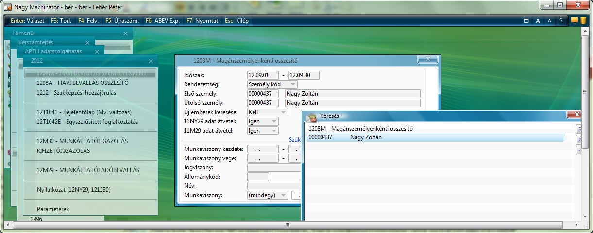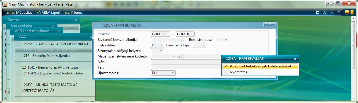 A 1208M menüpont elindítása után először az időszakot kell megadni. Az időszak megadása után, a beállított személyszűkítést figyelembe véve, a program legenerálja az adatokat. A generálás végén megjelenő ablakban azok szerepelnek, akikre a tárgy időszakban bármi adatot talált a program. Még ebben az ablakban lehetőséget biztosít a program egyes emberek törlésére, vagy új emberek hozzáadására is. Az emberek adatait meg lehet tekinteni, ill. igény esetén módosítani is lehet azokat.