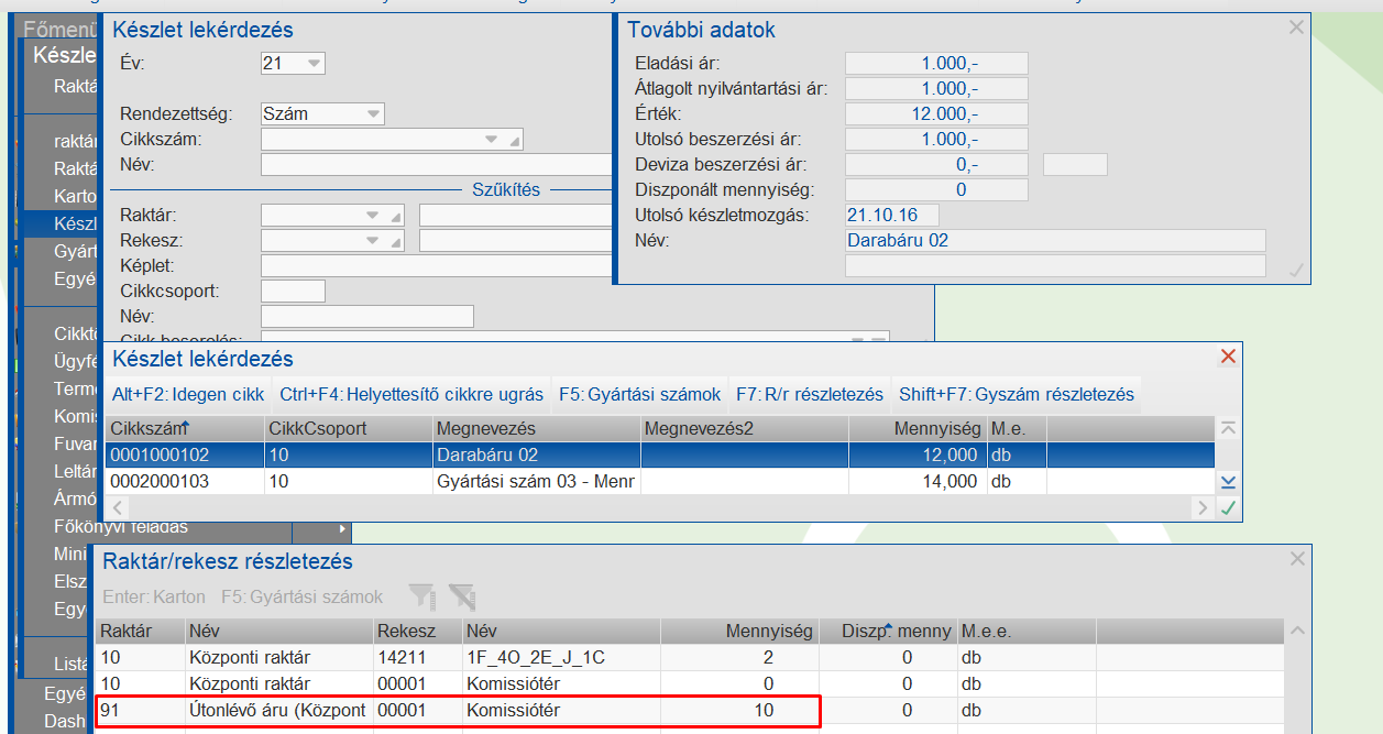 Készletlekérdezés - Útonlévő raktár