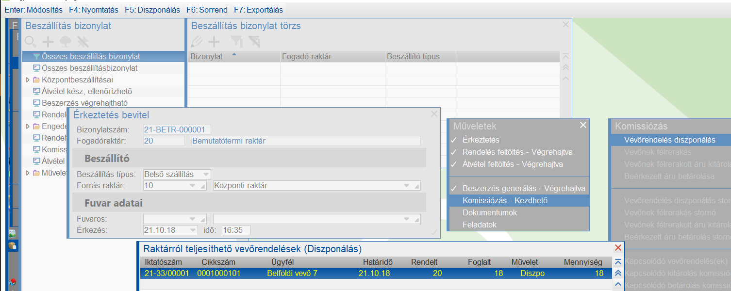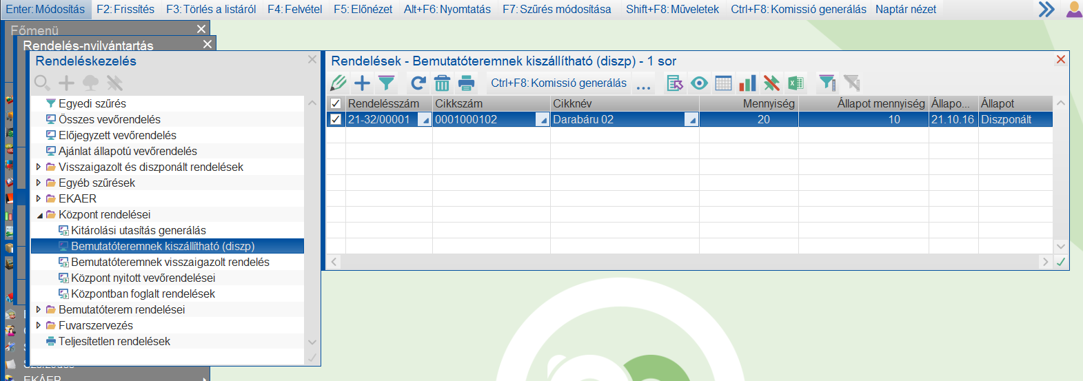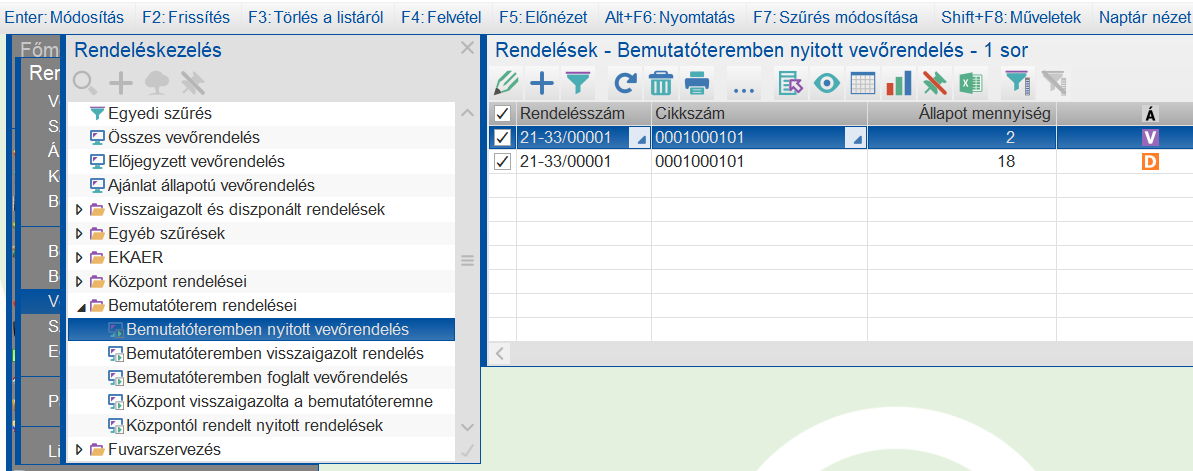 A bemutatóteremre vonatkozó Diszponálható vevőrendeket megmutatja a program.