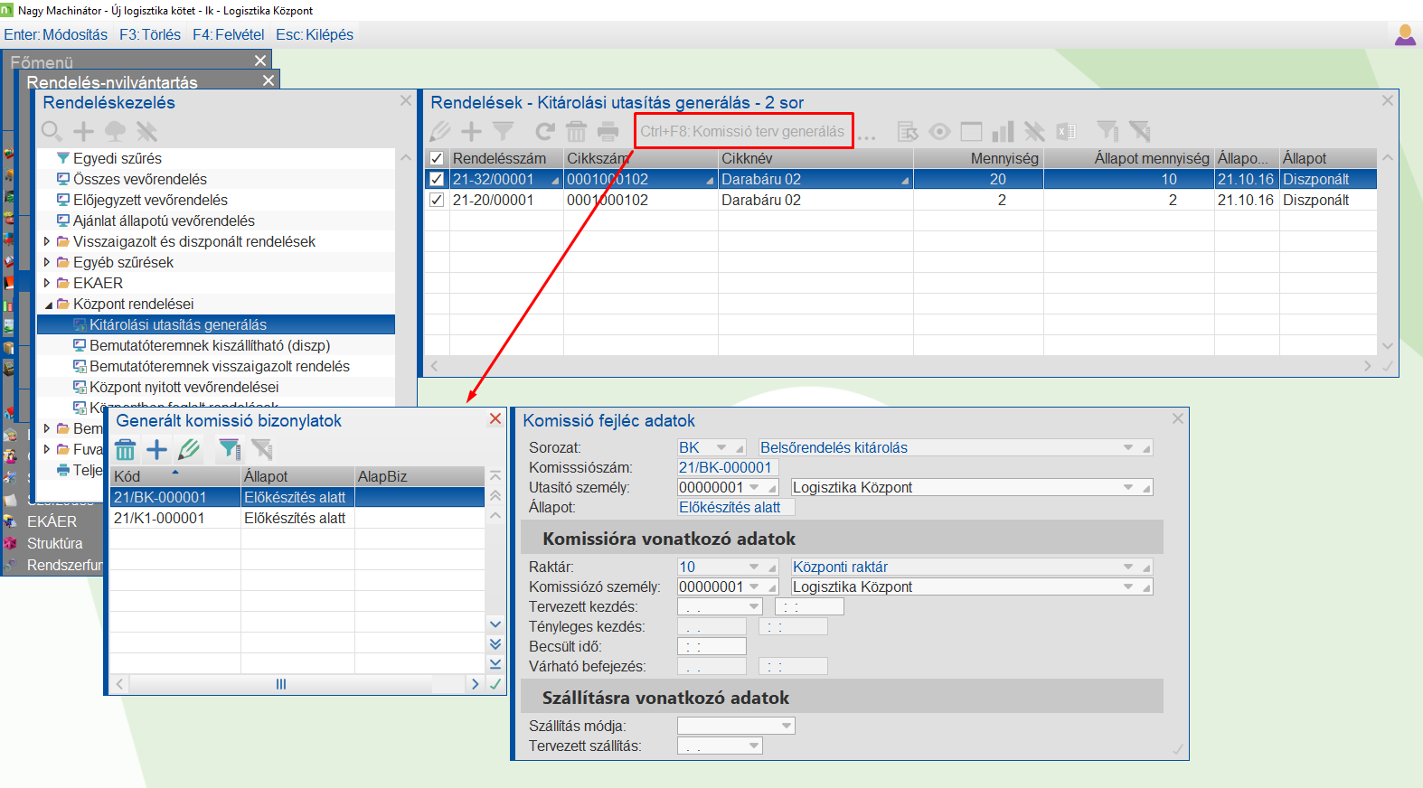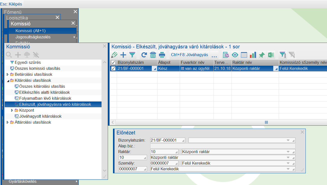 Miután a logisztikus legenrálta az utasításokat, a központi raktár vezetőjének lehetősége van lekérdezni a feldolgozásra váró utasításokat, majd azokat komissiózó raktári dolgozókhoz tudja rendelni.