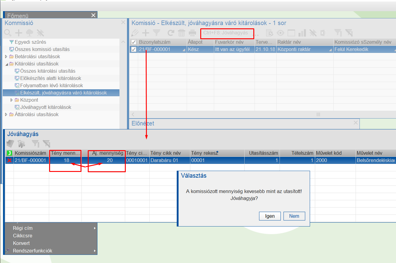 Jóváhagyás művelet elindítása után azoknál a tételeknél, ahol valami eltérés mutatkozik a jóváhagyás csak "kézi" elfogadás után indul csak el.