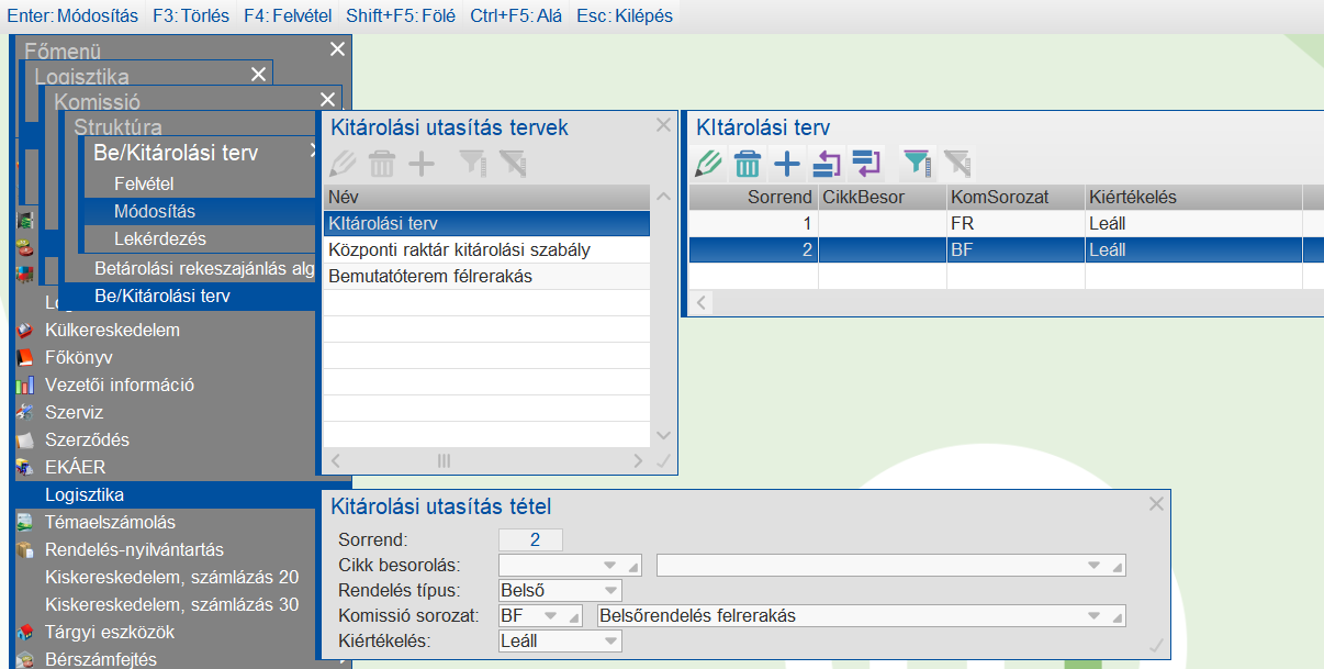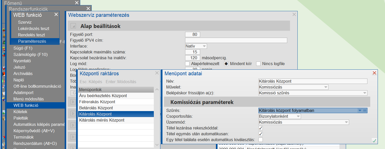 Komissió menüpont paraméterezése a bemutatóterem esetén