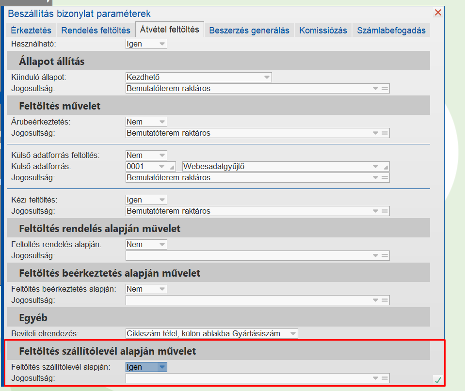 Beszállításbizonylat paraméterezése