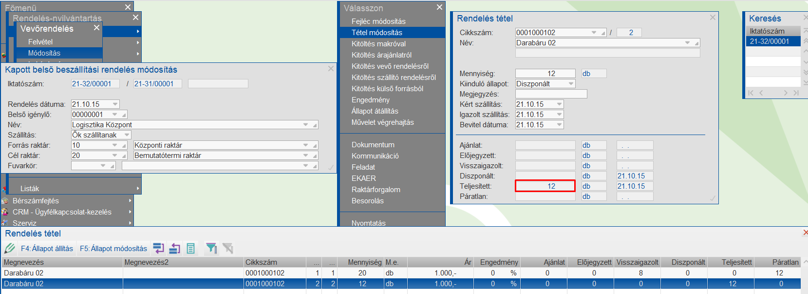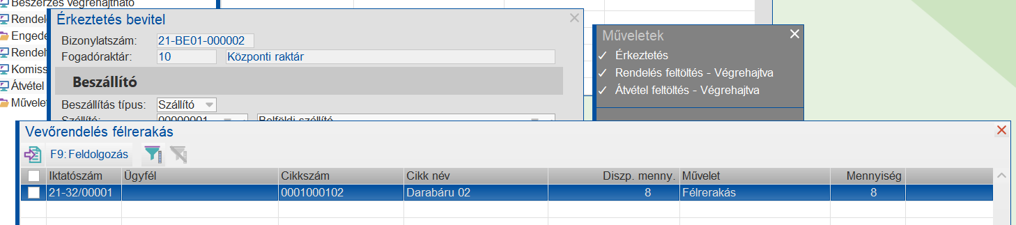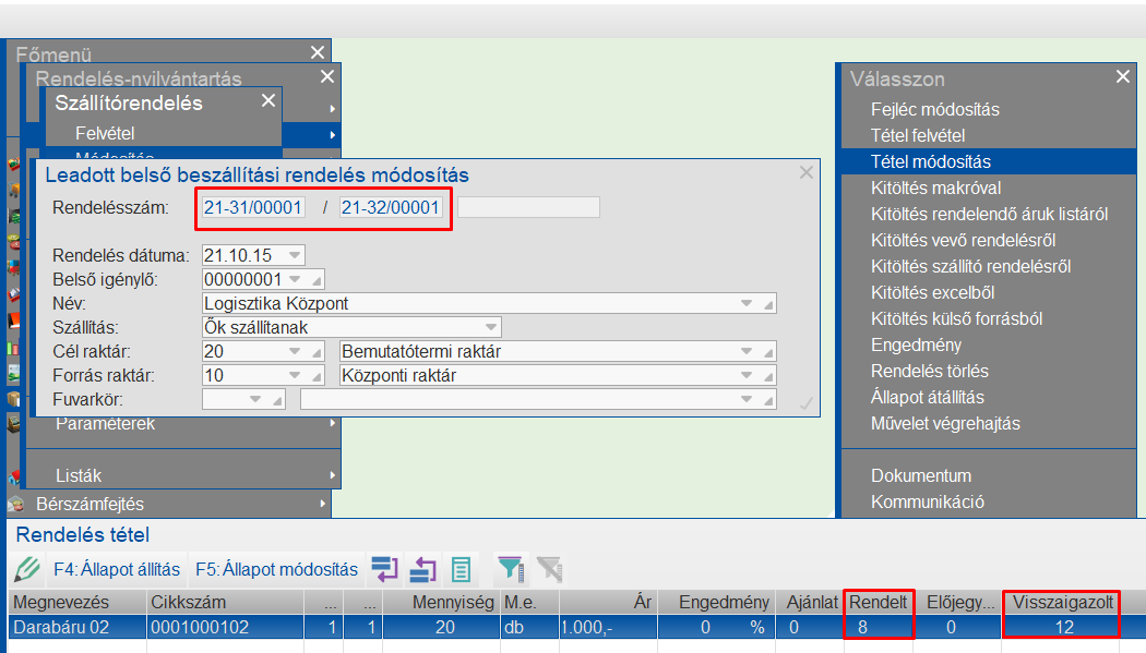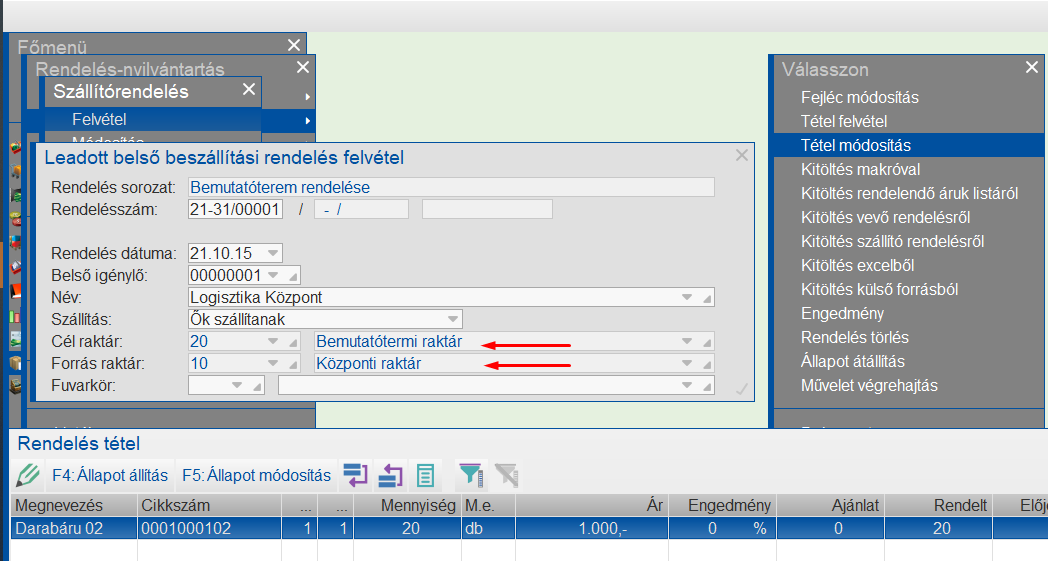 A program kezeli azt az eshetőséget is, hogy a központi raktárba érkezett áru nem vevőrendelésre, hanem belső rendelésre érkezett.