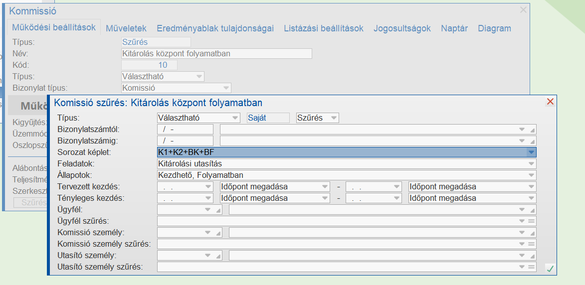 A műveletben hivatkozot komissiószűrés beállítása.