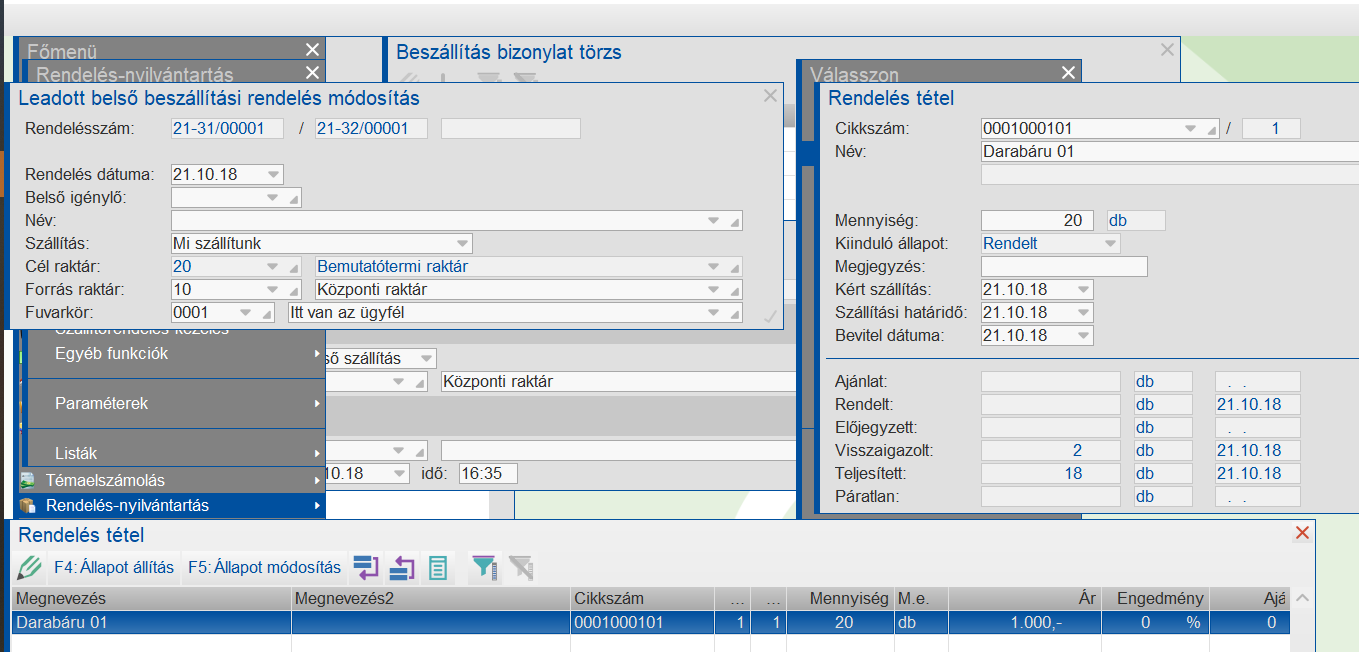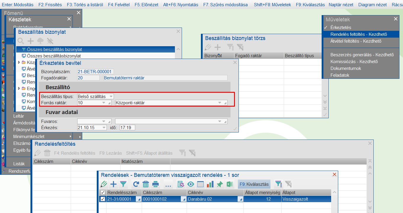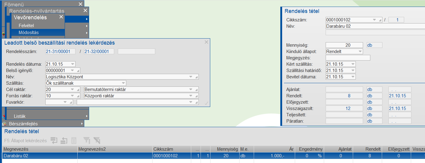 Belsőrendelés lekérdezés a beszállítás után