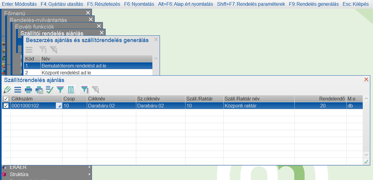 A rendelésajánlás menüpontban kell hivatkozi arra, hogy a raktárban megadott terv alapján kell a rendeléseket generálni.