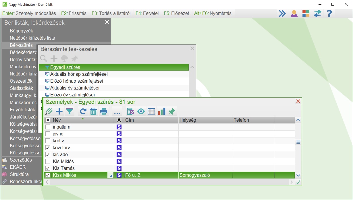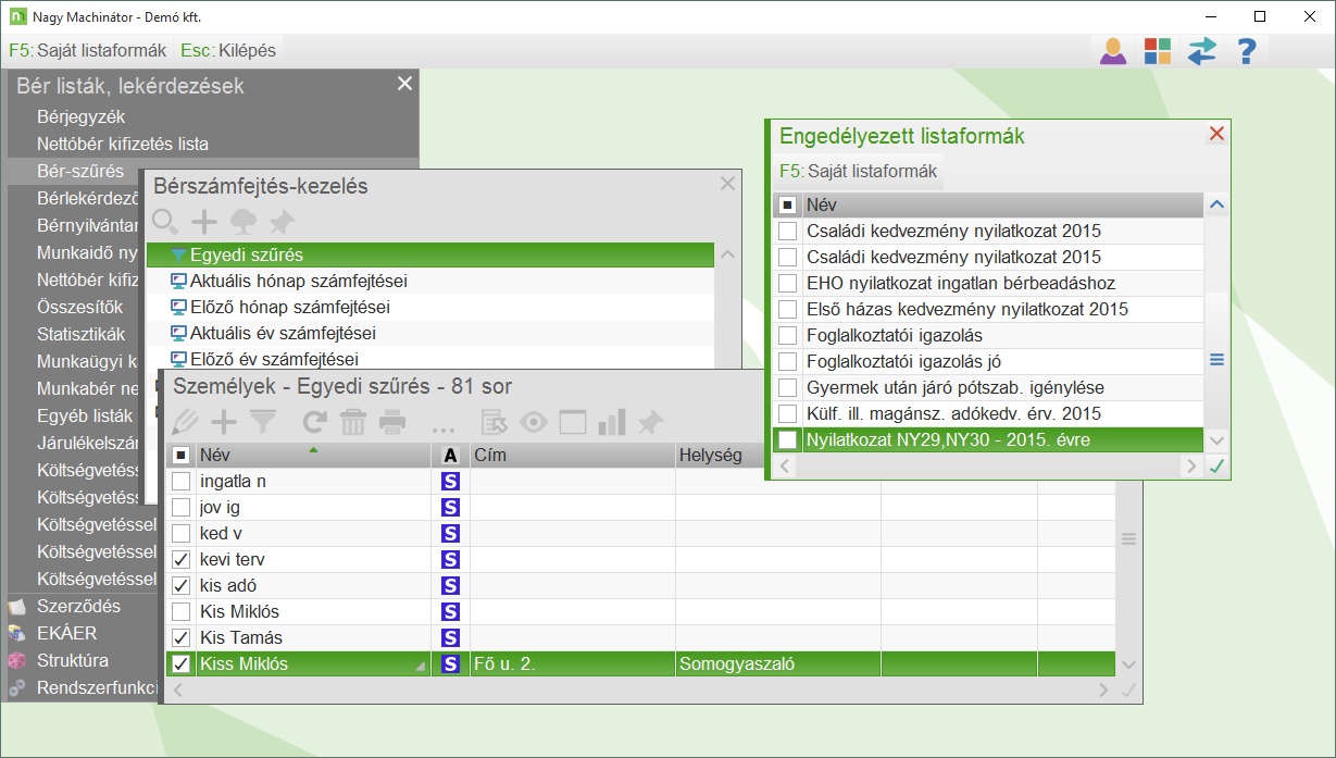 A szűrés eredményeként megjelenő rácsablakban a nevek előtt szereplő pipa ki-bekapcsolásával még szűkíthetjük azoknak a körét, akinek szeretnénk nyomtatni nyilatkozatot. Azon személyeket, akiknek az állapota "Számfejtéskor ne ajánlja", a szűrés nem hozza.