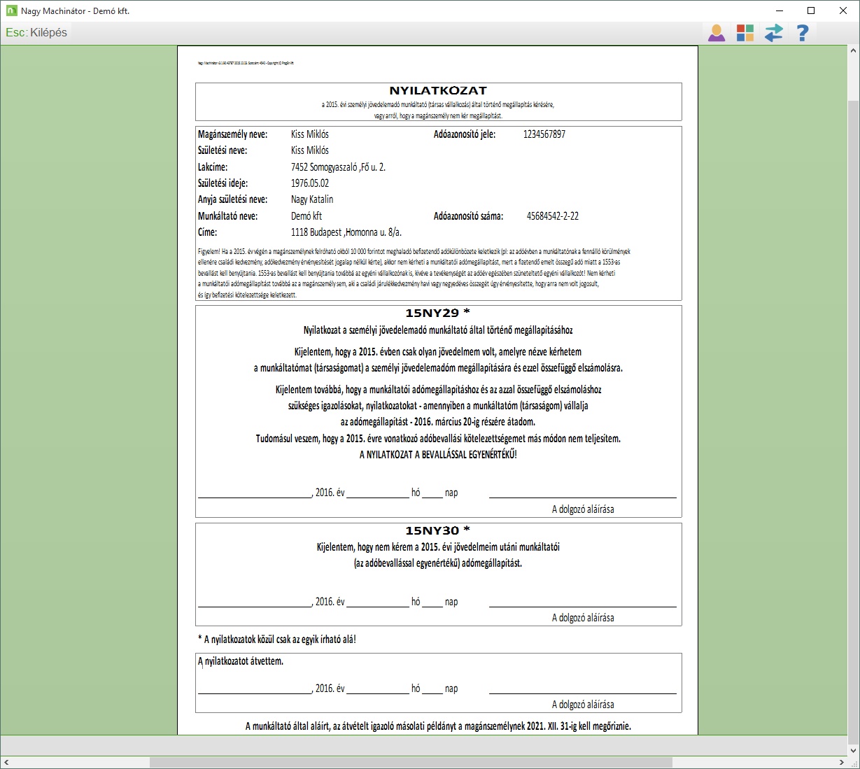Ezt a nyilatkozatot azért készítettük (az NY31-es nyomtatvány adattartalmához hasonló), hogy a munkáltató ezen tudja nyilatkoztatni a munkavállalót, hogy adóhatósági adómegállapítást kér, és ezen nyilatkozat alapján tudja rávezetni az M30-as nyomtatványra a munkavállaló döntését, majd az M30-as nyomtatványt január 31-ig részére kiadni.