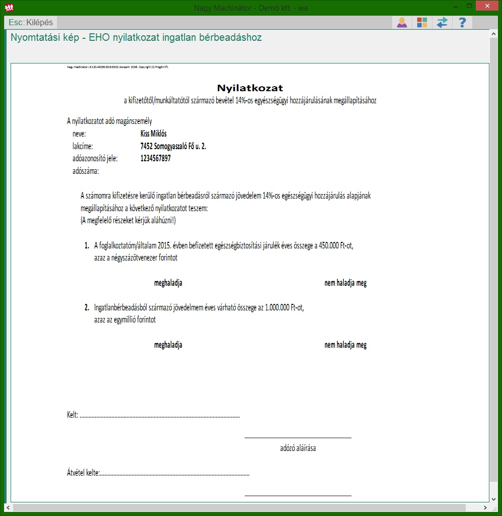 A szűrésnek megfelelő személyeknek EHO nyilatkozat nyomtatható ingatlanbérbeadáshoz, a 14%-os EHO megállapításához kérhetünk nyilatkozatot.