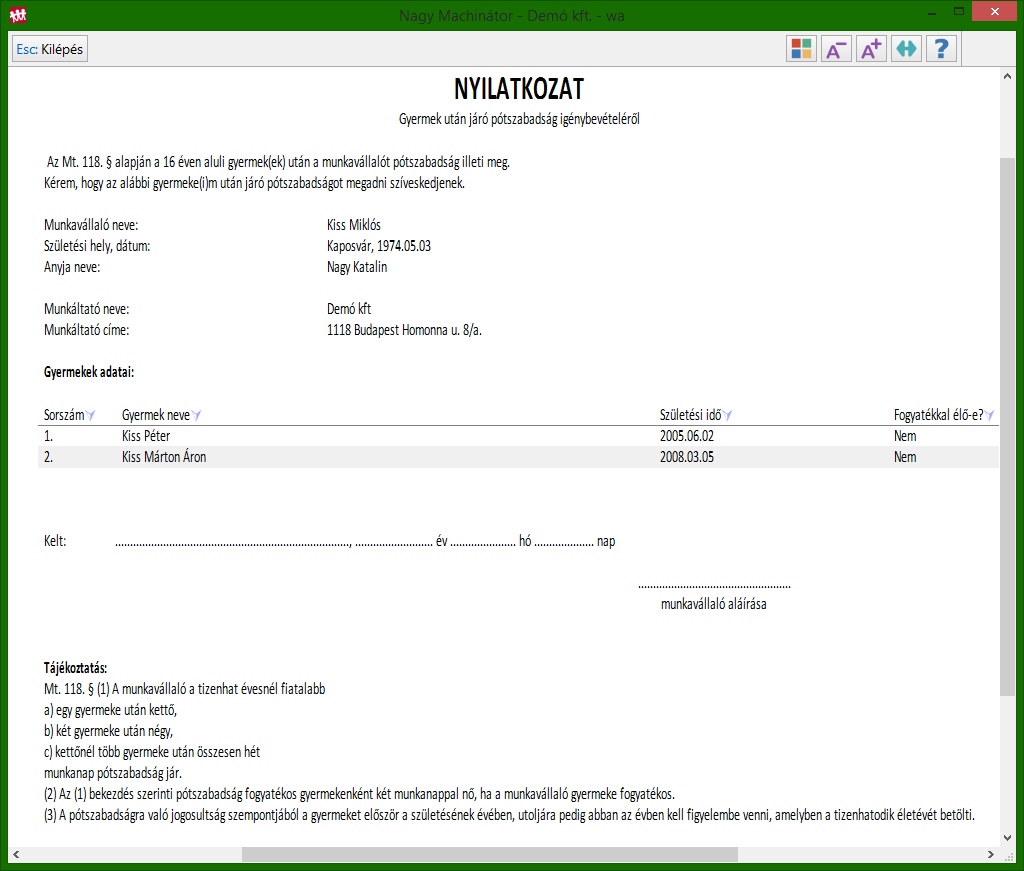 A nyilatkozat kiadása nincs hatással az M30-as nyomtatvány kiállítására, csak segédletként szolgál.
