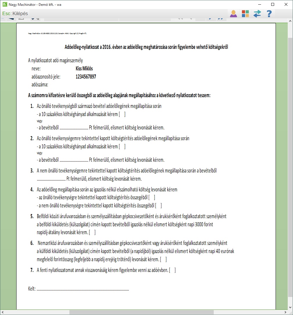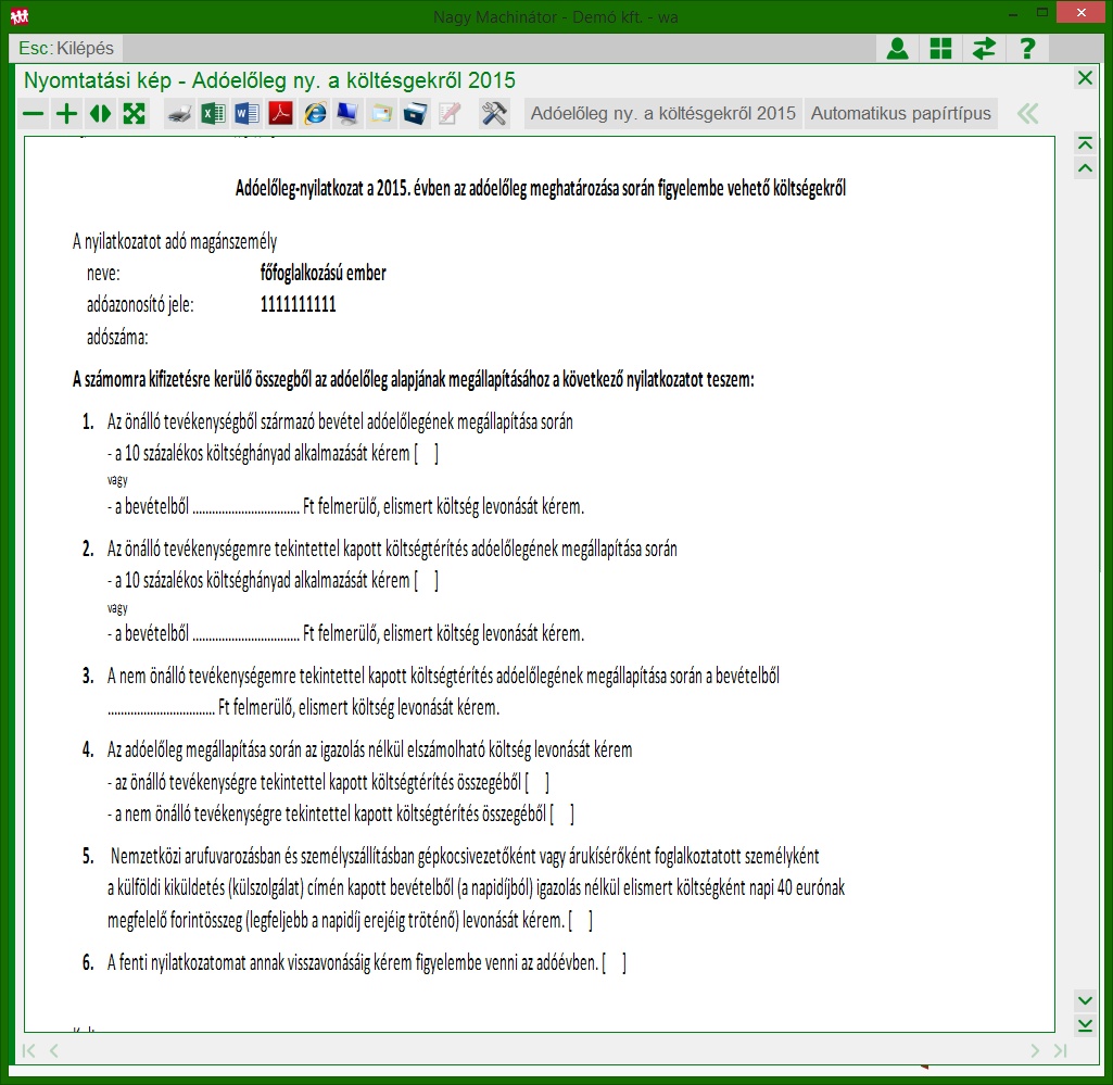 Adóelőleg-nyilatkozat a figyelembe vehető költségekről 2015