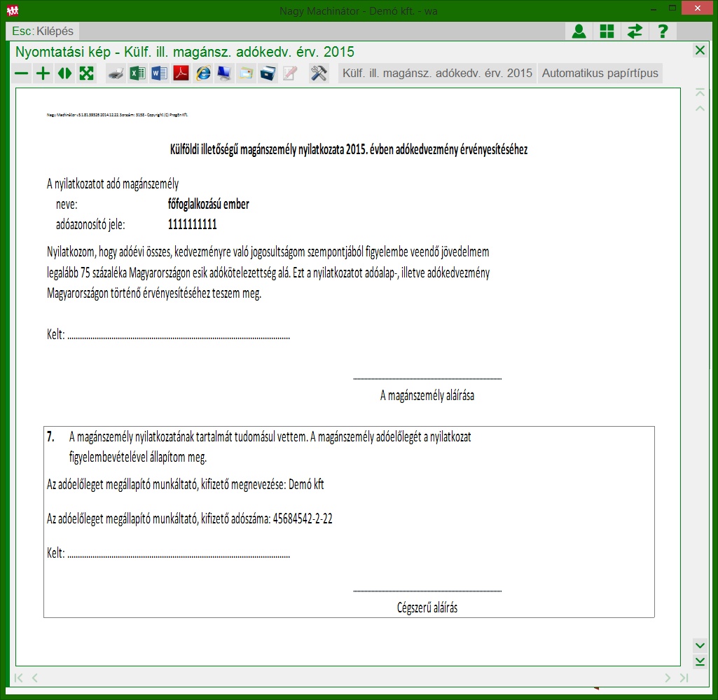 Külföldi illetőségű magánszemély nyilatkozata az adókedvezmény érvényesítéséhez 2015