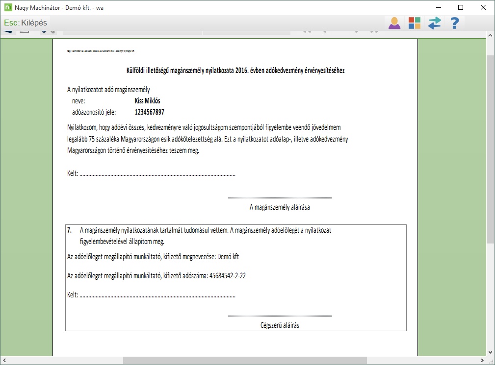 Nyilatkozat külföldi illetőségű magánszemély adókedvezmény érvényesítéséről