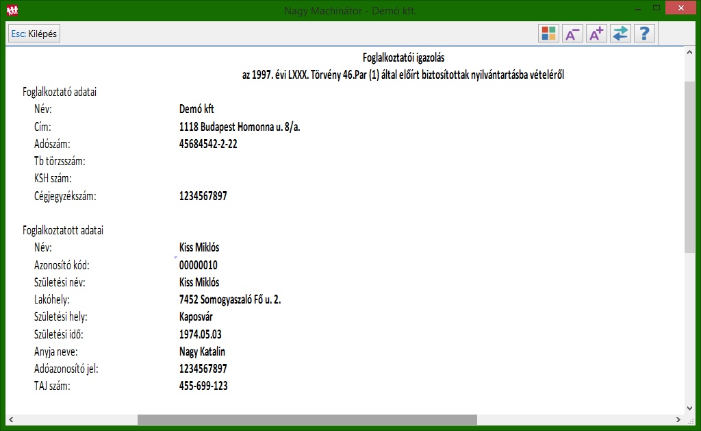 A szűrésnek megfelelő személyeknek A 1997. évi LXXX tv. 46 § (1) előírásnak megfelelő foglalkoztatói igazolás nyomtatható.