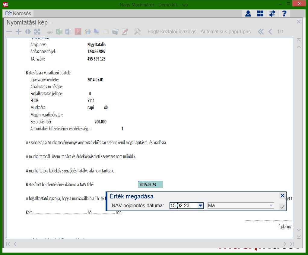 A listán a nyomtatási képen a "Biztosított bejelentése a NAV felé" mező értéke módosítható, a kis kék háromszögre kattintva beviteli mező nyílik meg, amelyben megadhatunk egy dátumot. Alapértelmezetten mindig a nyomtatás dátuma kerül megajánlásra.