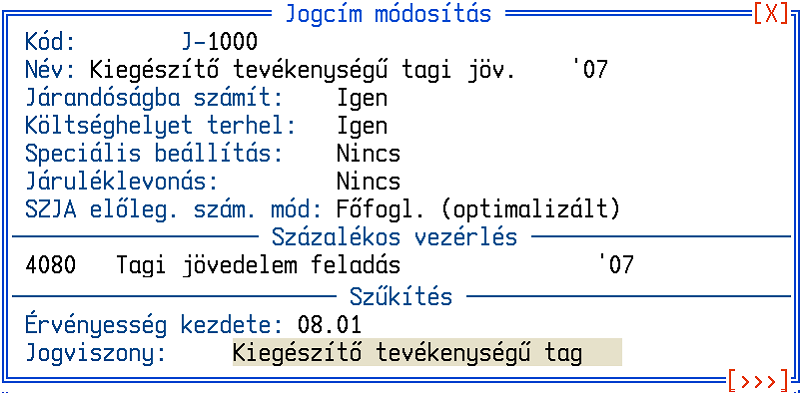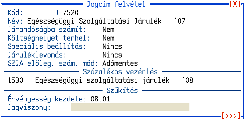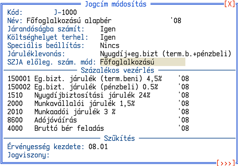 A 0808M járulékokra, jogviszonyra vonatkozó lapjainak azonosítására szolgáló eljárás megváltozott. Egy alkalmazásminőségen belül a jogviszonyt a jogviszony megkezdésének időpontja (ÉÉHHNN formátumban), plusz egy három jegyű sorszám azonosítja. A program a számfejtés során meghatározza, az adott alkalmazás minőségen belül a jogviszony-azonosítót. Az azonosítót csak a0808M bevallás fogja figyelembe venni. A kapott azonosítót leellenőrizni vagy módosítani a Kézi számfejtés menüpont alatt lehet. Automata számfejtéssel számfejtett jogcímek jogviszony azonosítója is lemódosítható. A jogviszony-azonosító képzés szabálya a következő: 1, A program a leszámfejtett Jogcím alkalmazás minősége alapján a Személytörzs / Alkalmazás minősége (NYENYI) menüpontban felvett adatok alapján határozza meg a jogviszony kezdetét. Erre azért van szükség, mert abban az esetben, ha dolgozó többször be-, ill. kilép az egyes időszakokat csak ebben a menüpontban van lehetősége a bérszámfejtőnek feltüntetnie. 2, Amennyiben az 1.pont szerint nem talál érvényes rekordot munkaviszony jellegű alkalmazás minőség esetén a személy alapadatai között megadható "munkaviszony kezdete" dátum, nem munkaviszony jellegű alkalmazás minőség esetén a jogcímhez megadott megbízás kezdete dátum lesz a jogviszony kezdete. (Részletes algoritmus: 1, BérJogcím.MegbízásVége, ha üres a BérJogcím.Dátum és SzemTörzs.MunkaViszV közül a kisebb dátumnál, a SzemélyAlk állományban a Személy+Alkalmazás+DátumTól+Sorszám indexen megkeressük az érvényes rekordot. Ha az érvényes rekord előtti azonos Személy+Alkalmazás+Sorszám rekordban a DátumIg = most érvényes rekord DátumTól-1nap, akkor ez az új érvényes rekord. Így kell időben visszamenni az első érvényes rekordig, ebben a rekordban a DátumTól+Sorszám mezők tartalma lesz munkaviszony azonosítója. Ez az algoritmus azt a helyzetet hivatott lekezelni, ha valaki minden évben felveszi mondjuk a 20-as alkalmazásminőséget és folyamatos időintervallum alapján el lehet jutni a jogviszony kezdődátumához. Ha a SzemélyAlkban nem volt érvényes rekord, akkor BérJogcím.Dátum időpontra az AlkMin állományban meg kell vizsgálni az adott alkalmazásminőség Munkaviszony:Igen vagy Nem. Ha Igen, akkor a Jogviszony azonosító= SzemTörzs.MunkaViszK+001, Ha nem akkor BérJogcím.MegbízásKezd+001)